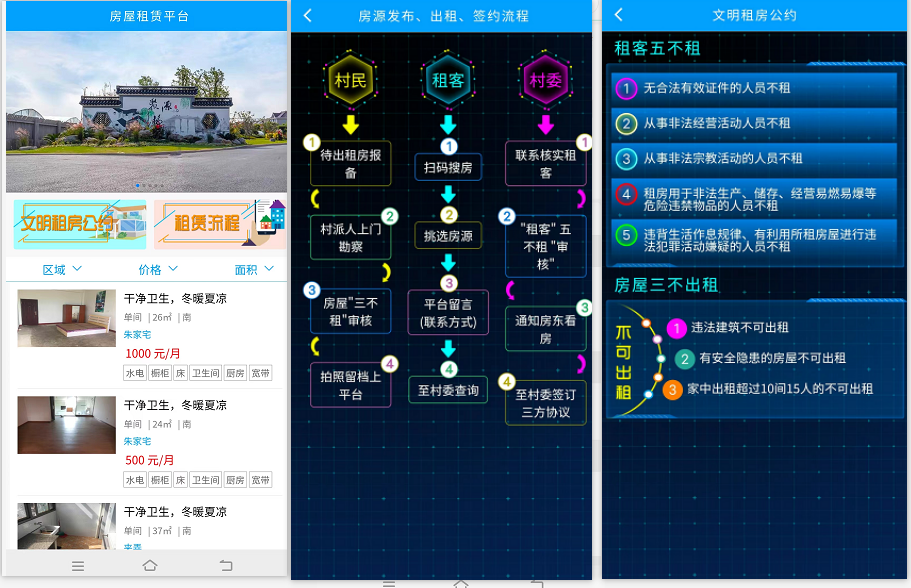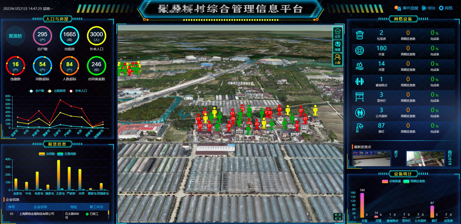 以智能信息化设施的建设和应用为支撑,为村域美丽乡村建设提供基础数据支撑。通过相关条线数据的采集分析实现本村的人口信息、房屋情况、居住租赁的信息数据档案库,对外来人员租赁合同备案监管形成有序动态管理。