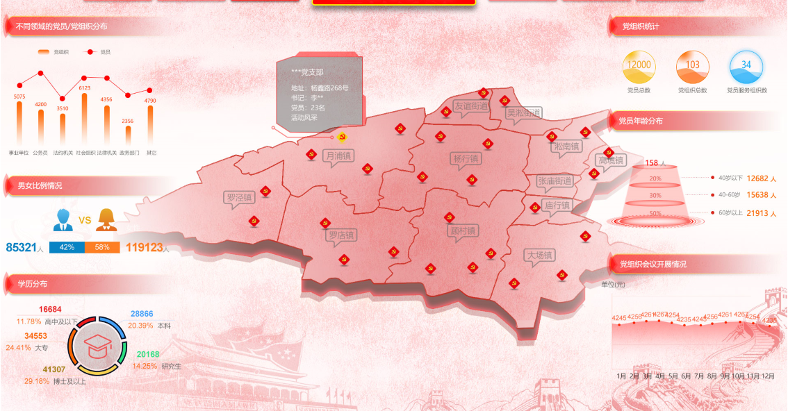 通过先进的电子地图展示系统范围内各个辖区党员数、党支部数目,实现了党支部、党员网格化管理。以辖区党员、党支部信息为基础库,对党务工作进行管理。