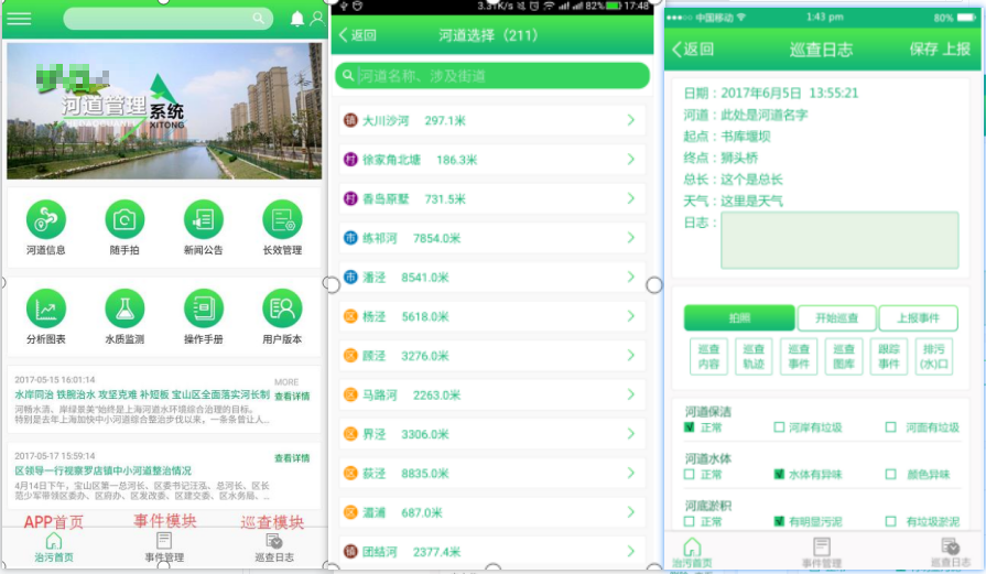 APP移动端的应用是该信息系统传输信息数据最有效的办法,事件的上报需要及时反馈、批示、处理,结案。巡查过程的现状录入便捷,河长日志的填写随手可处理。