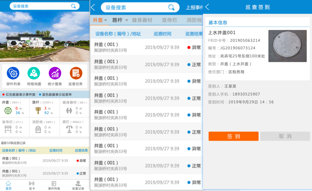 实现二维码扫码,电子标签读取,资源的移动端查询,巡查人员的签到、巡查事件的上报、流转和处理。